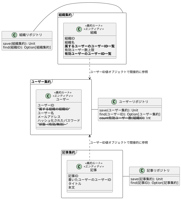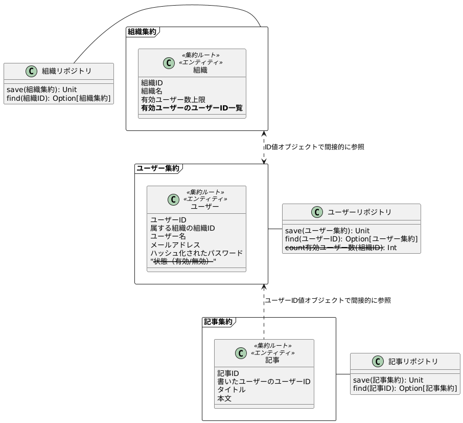 この案ではユーザーの有効/無効状態のみ組織集約に移しており、どのユーザーがどの組織に属するかの情報はユーザー集約に残しています。 コードはほぼ同じですので割愛します。